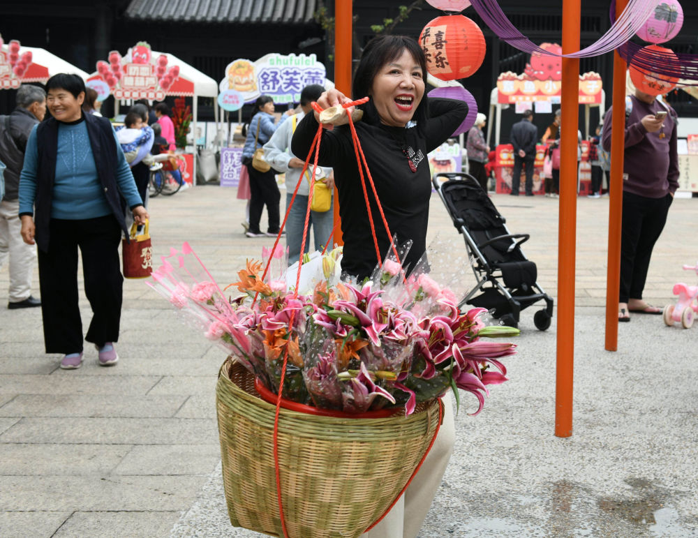 ↑ 2月12日,游客在荔湾湖公园船桨广场体验“卖花”。新华社发(许建梅 摄)