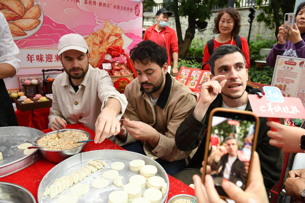 ↑ 2月12日,外国友人在2026广州水上花市开市现场学习制作油角。新华社发(许建梅 摄)