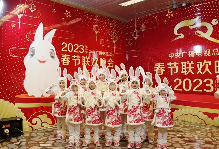 马兰花儿童声合唱团在2023年央视春晚彩排前合影留念。新华社发(张曼华摄)