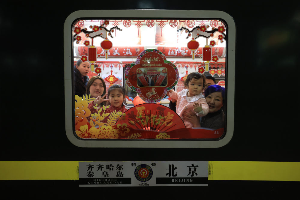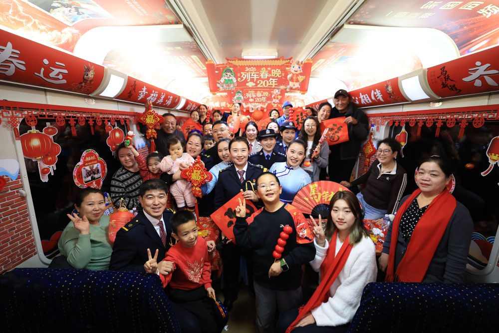 ↑2月13日,旅客在T48次列车“春晚”现场打卡拍照。新华社发(徐率 摄)