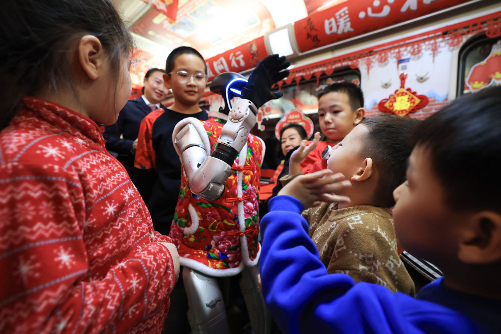 ↑2月13日,小朋友在T48次列车上与仿生机器人握手。新华社发(徐率 摄)