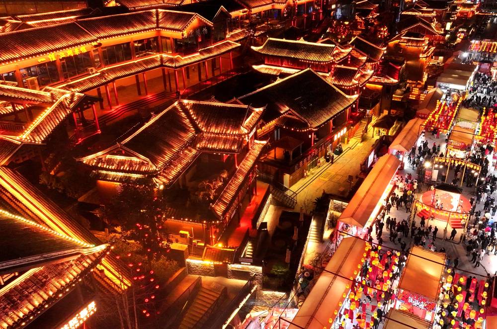 ↑ 2月17日,游客在湖北省宣恩县城兴隆老街的小吃一条街上品美食(无人机照片)。新华社发(宋文 摄)