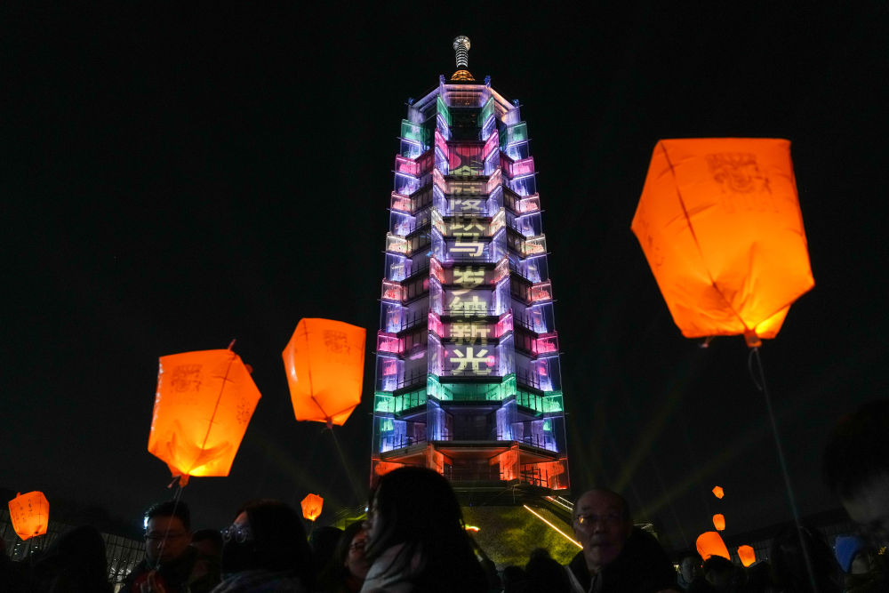 ↑ 2月17日,南京大报恩塔点亮多彩灯光庆祝春节。新华社记者 李博 摄