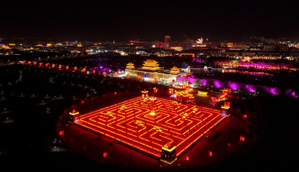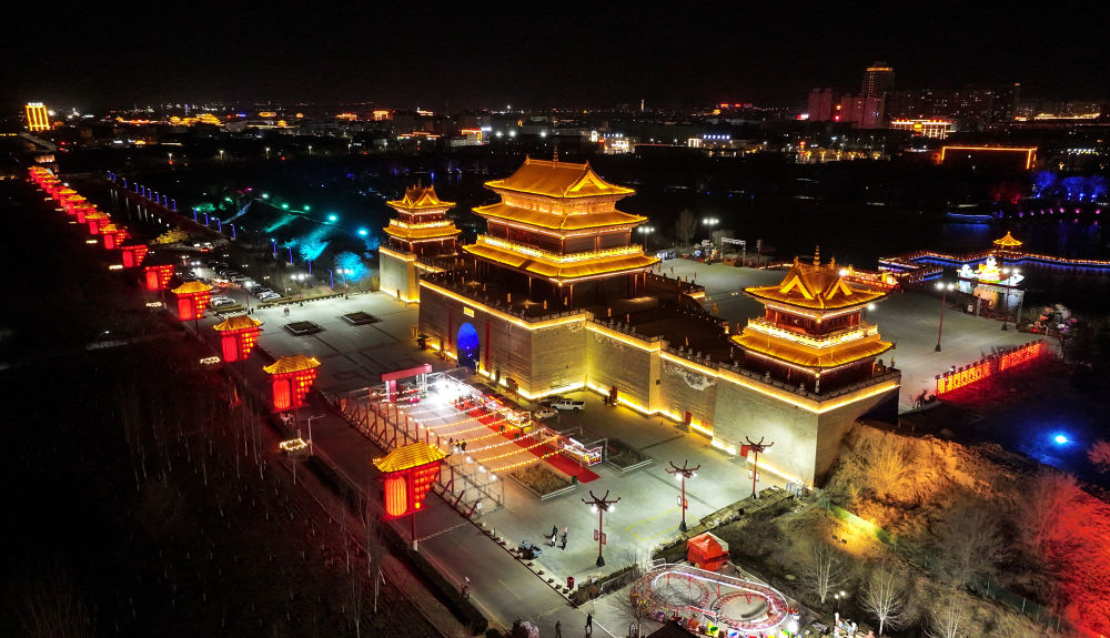 ↑ 这是2月18日拍摄的宁夏盐池县九曲民俗文化园和长城关夜景(无人机照片)。新华社记者 冯开华 摄