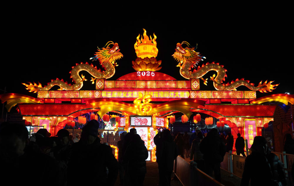 ↑ 2月17日,游客在北京国际鲜花港彩灯大世界参观游览。新华社发(梁志强 摄)