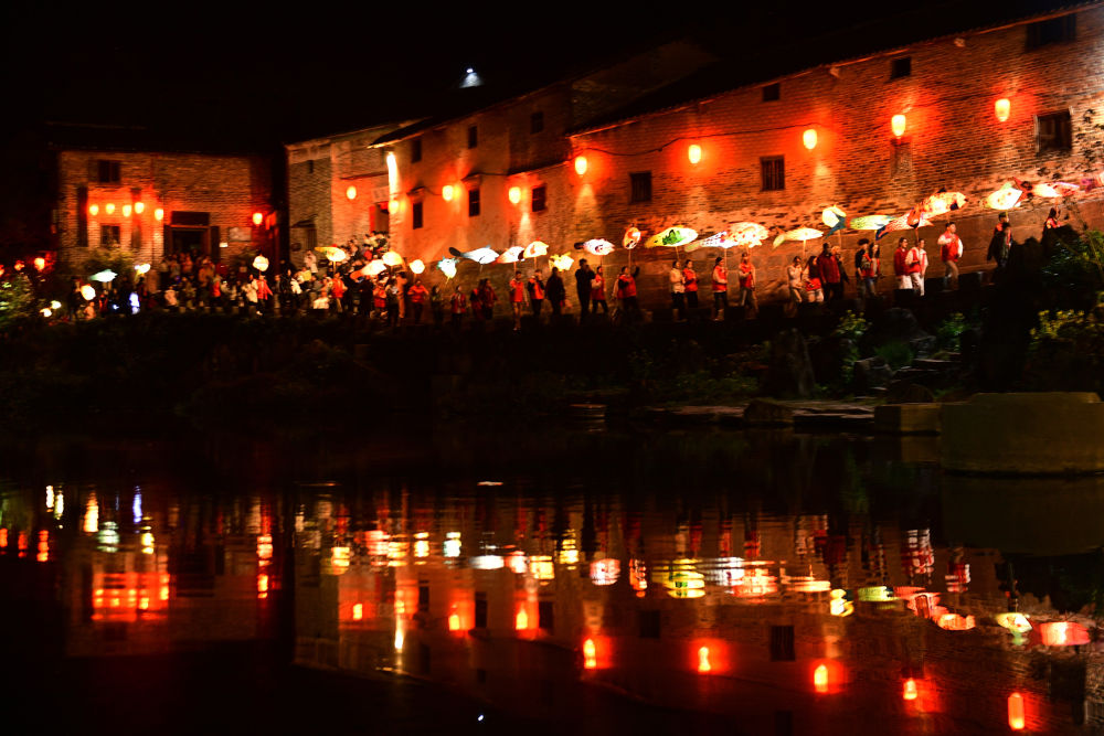 ↑ 2月18日,人们高举鱼龙灯在广西贺州昭平县黄姚古镇老街游行。新华社发(黄旭胡 摄)