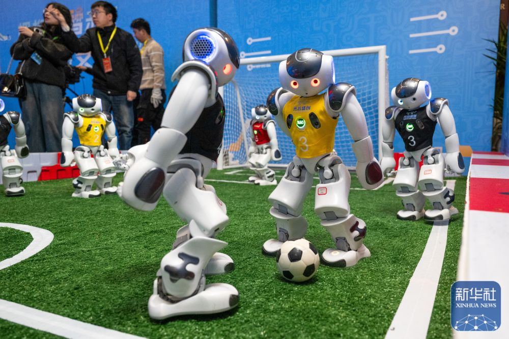 ↑ 2月24日,人形机器人在现场表演踢足球。