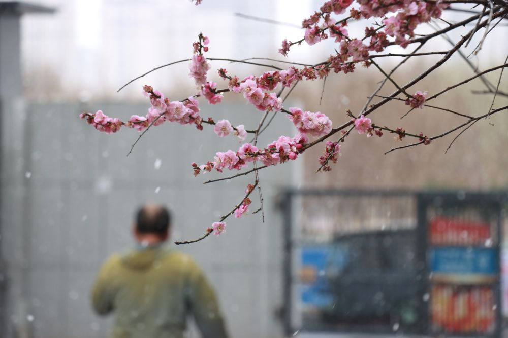 ↑ 2月23日,游客在陕西省西安市钟楼旁赏雪拍照。新华社发(薛刚摄)