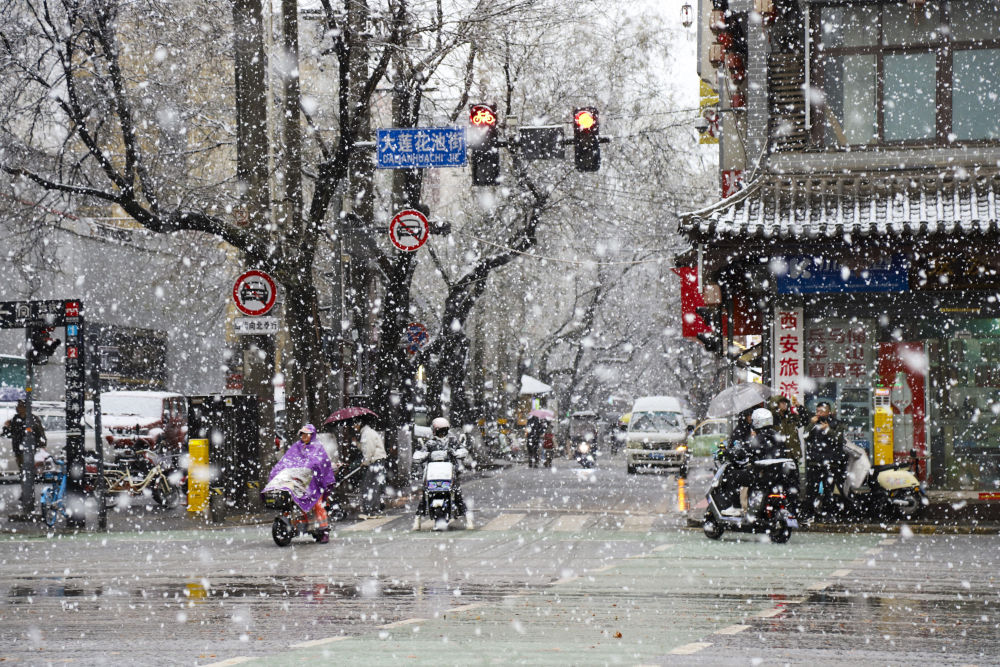 ↑ 2月23日,在陕西省西安市街头,市民冒雪出行。新华社发(薛刚摄)