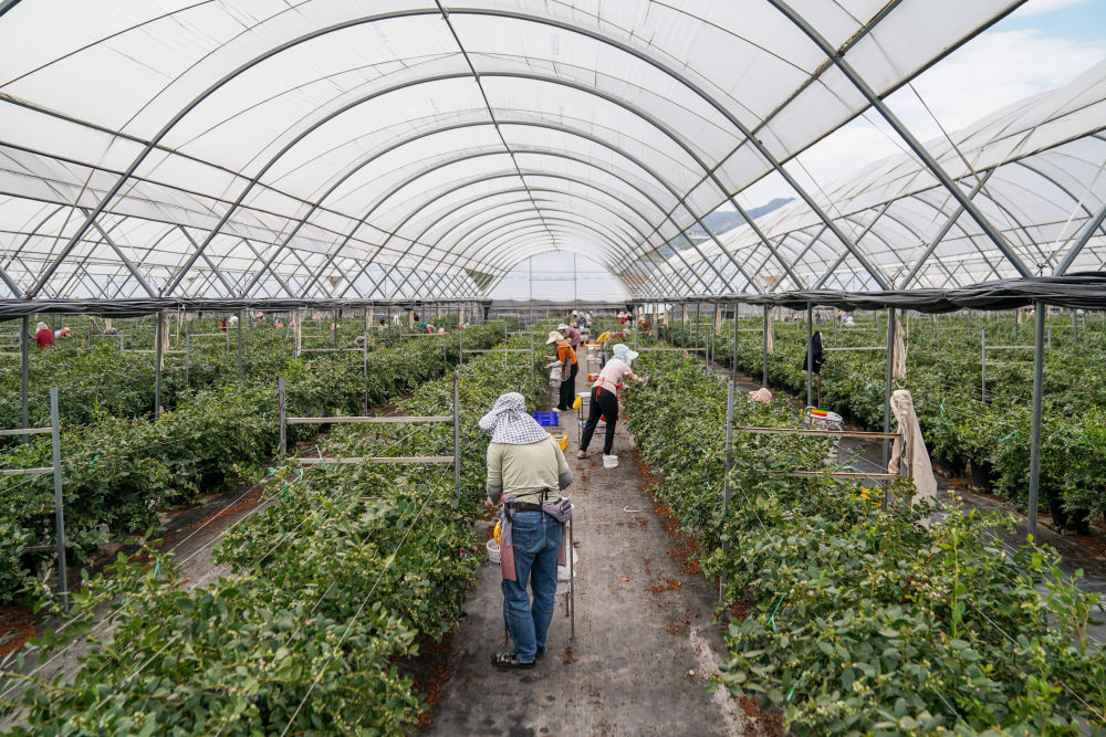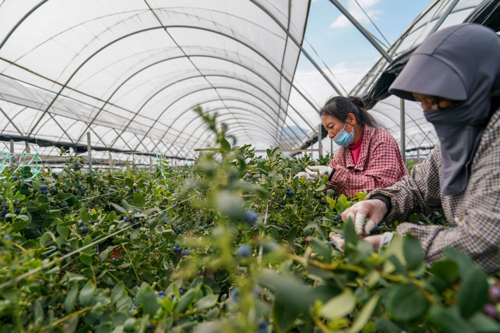 ↑ 2月27日,工人在蒙自市一处蓝莓生产基地采摘蓝莓。