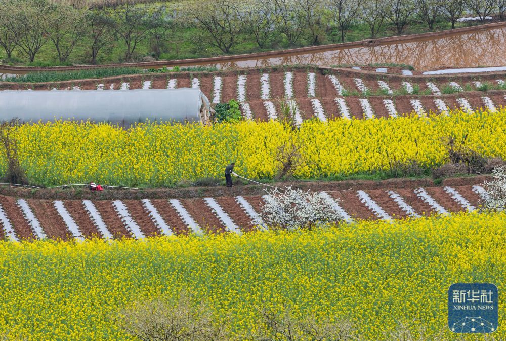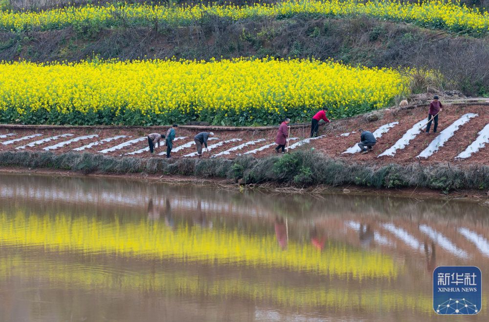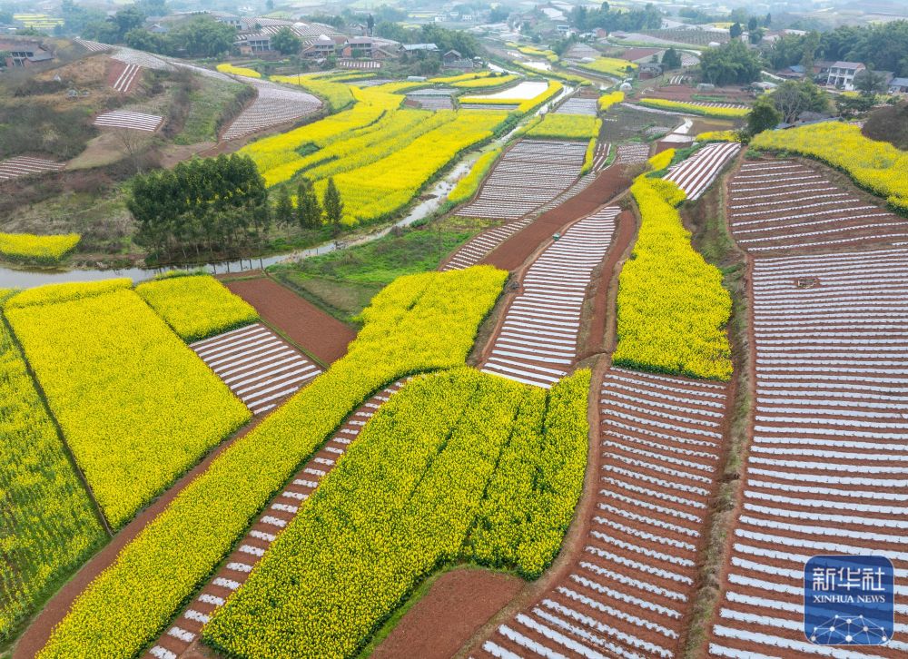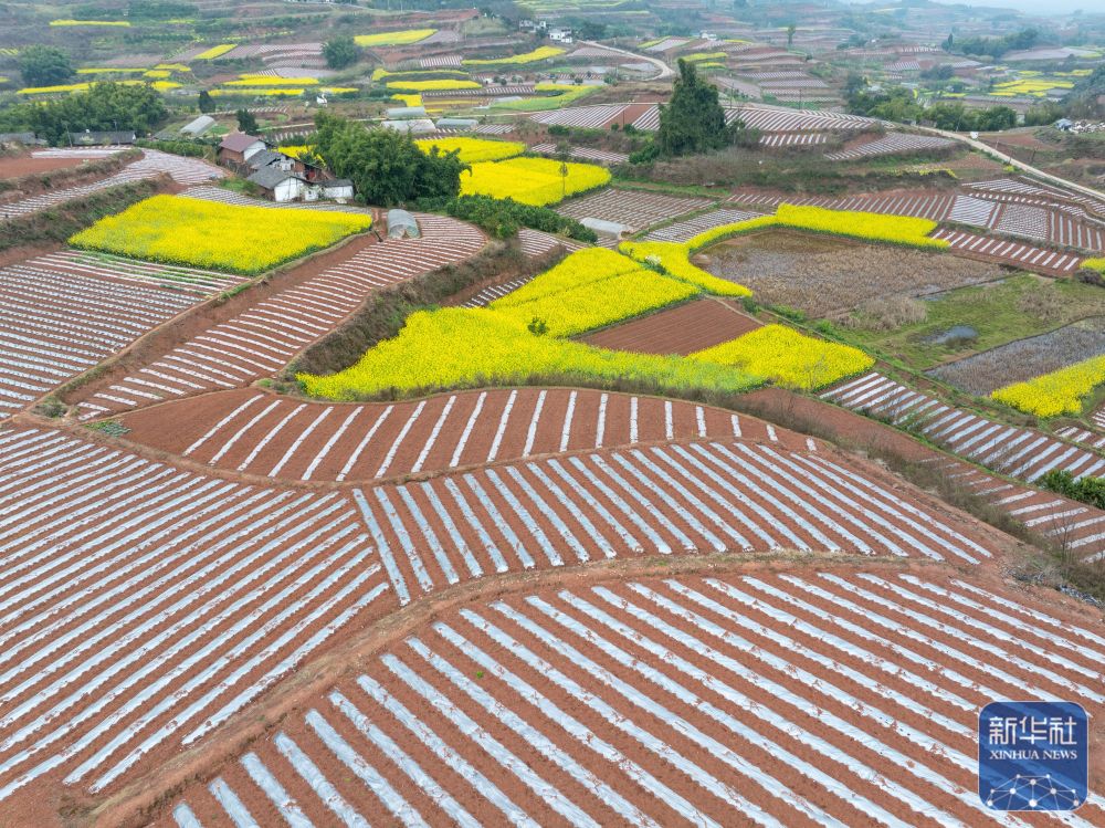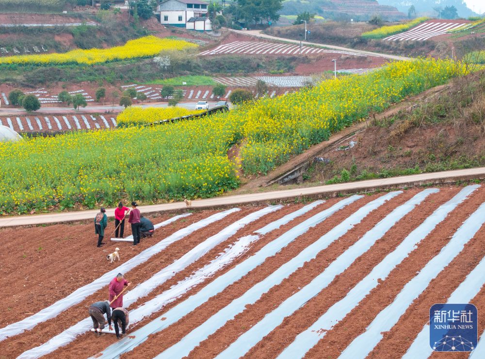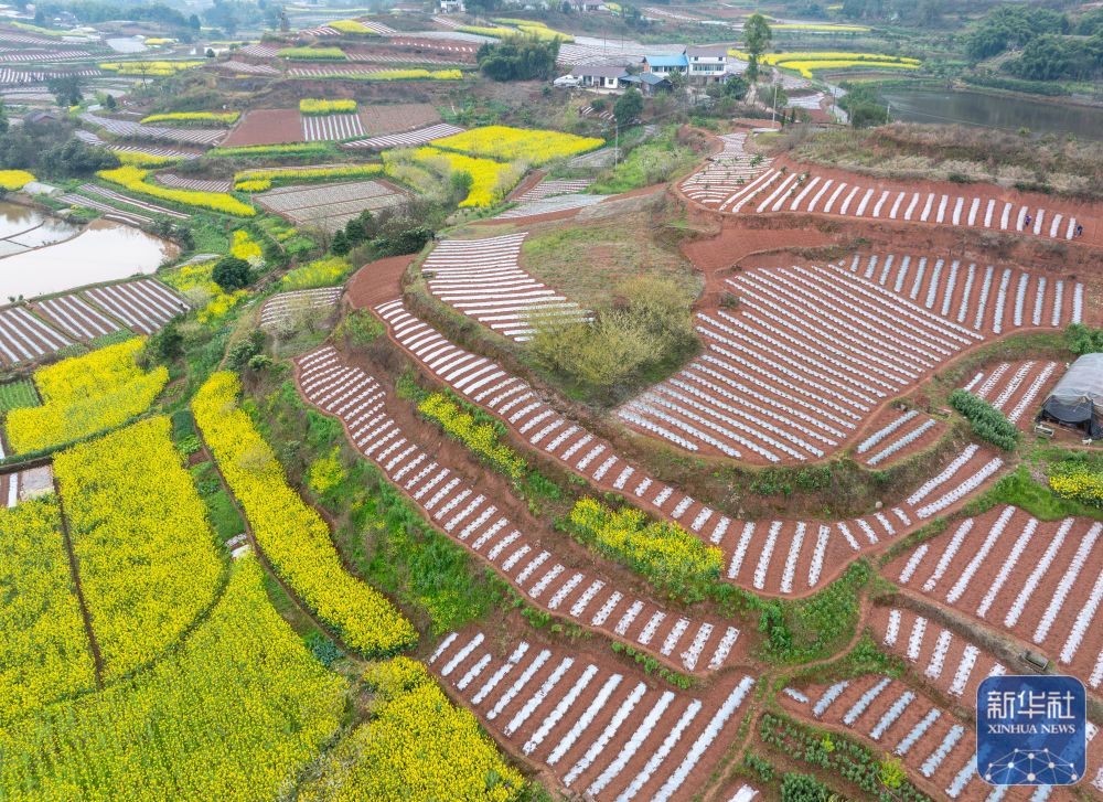 春意渐浓,四川省自贡市荣县乐德镇天宫庙村的村民开始覆地膜、种辣椒等,为春耕做准备。天宫庙村因土壤中富含铁泥质砂岩而呈赭红色,成为远近闻名的“乐德红土地”,赭红色的土壤、金黄的油菜花等形成的不同色块、线条在大地交织,形成大地的“调色板”。