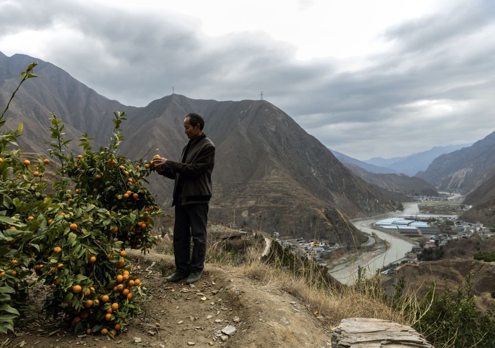 ↑ 3月2日,田济明在山顶上的柑橘园里查看柑橘生长情况。