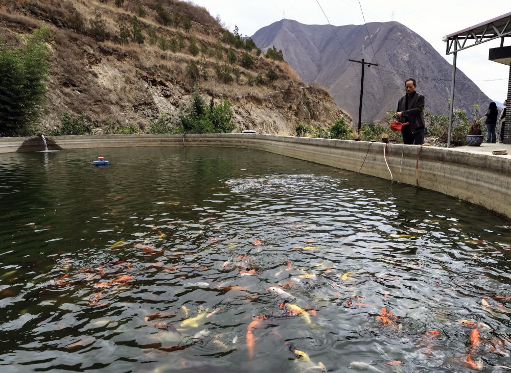 ↑ 3月2日,田济明在半山腰的养鱼池旁给饲养的观赏鱼投喂饲料。