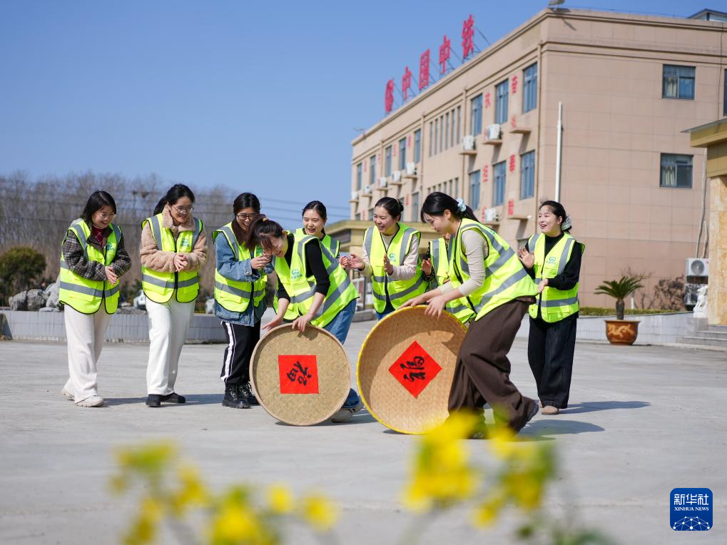 3月8日,在位于江苏省兴化市临城街道的中铁上海工程局盐宜铁路项目部,女职工们参加滚竹匾趣味比赛。新华社发(周社根 摄)