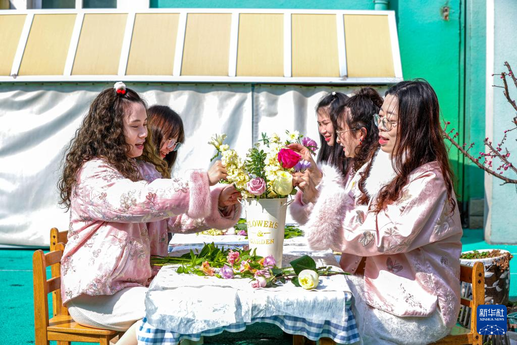 3月8日,在山东省临沂市沂南县张庄镇新时代文明实践活动中心,妇女参加插花艺术比赛。新华社发(王彦冰 摄)
