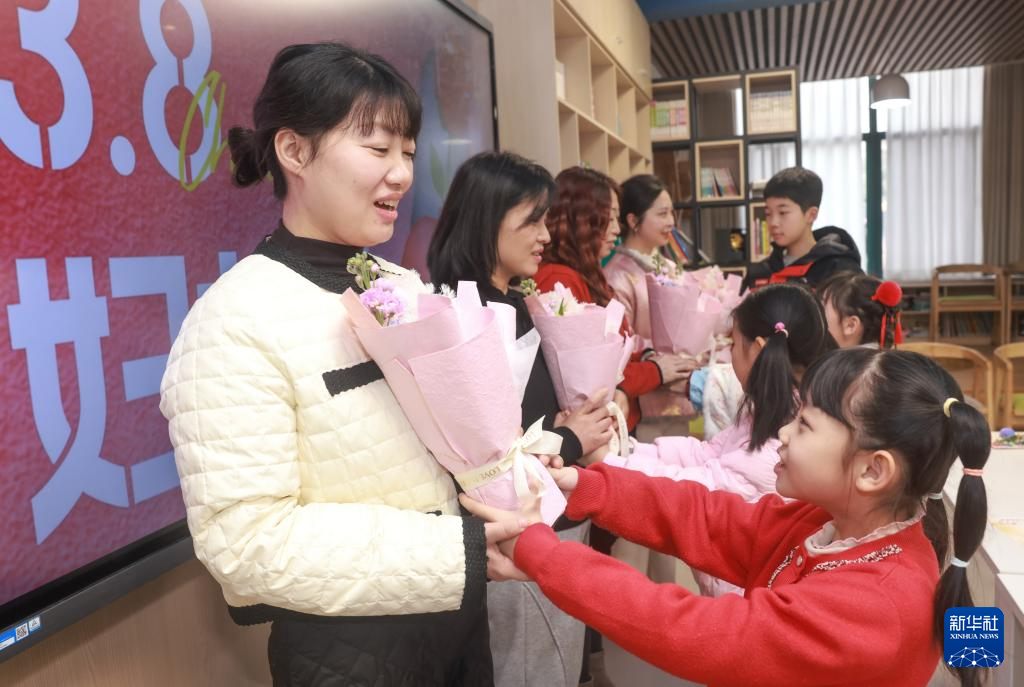3月8日,在武汉市洪山区未来实验小学美林校区,小学生为妈妈送上节日鲜花。新华社发(赵军 摄)