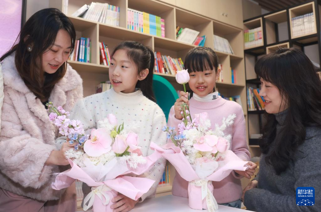 3月8日,在武汉市洪山区未来实验小学美林校区,小学生和妈妈一起学习插花。新华社发(赵军 摄)