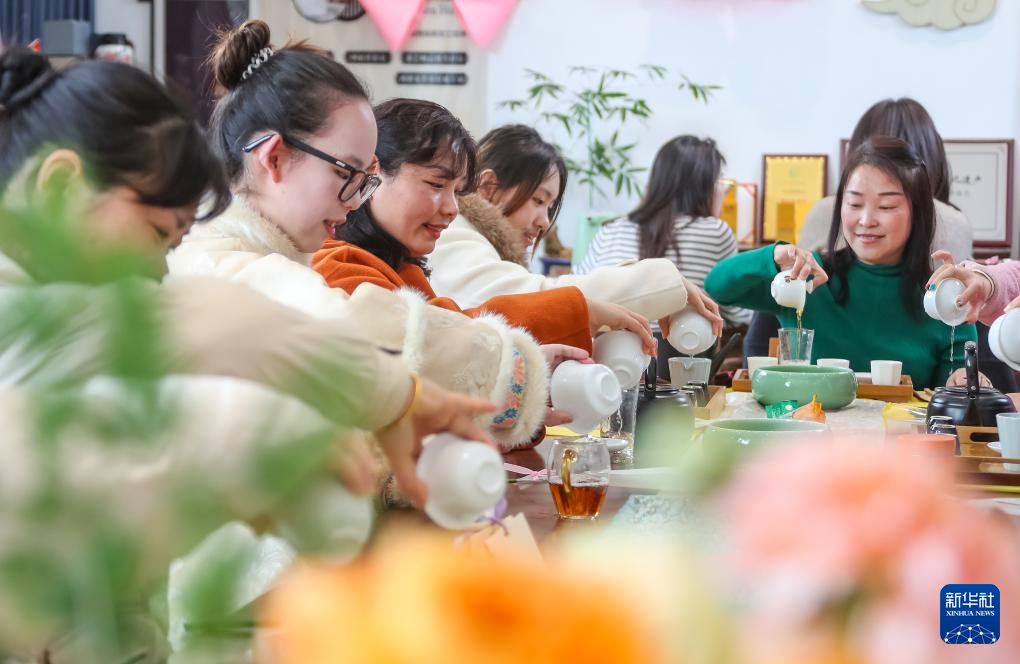 3月8日,江苏省句容市弘景小学女职工在庆“三八”活动中学习茶艺。新华社发(钟学满 摄)