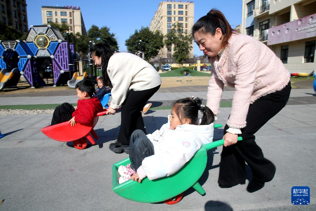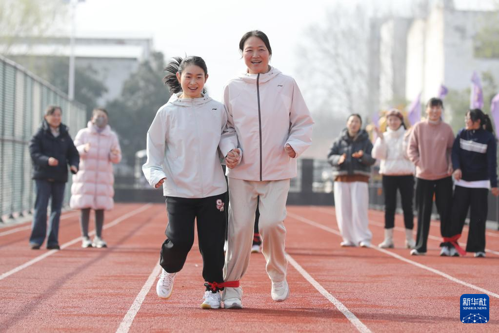 3月8日,在江苏省连云港市钟声幸福幼儿园“亲子游戏迎‘三八’”活动中,孩子和母亲一起参加亲子游戏。新华社发(王春 摄)