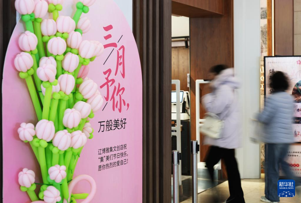 3月8日,辽宁省博物馆举行公益讲解、亲子互动、精品折扣活动。这是游客走进辽宁省博物馆文创商店。新华社记者 李钢 摄