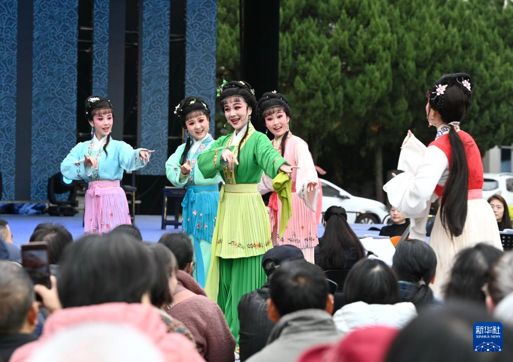 3月8日,在福建省福州市西湖公园则徐广场举行的“周末戏相逢”“三八”国际妇女节专场演出中,福建芳华越剧院演员在表演越剧。新华社记者 林善传 摄