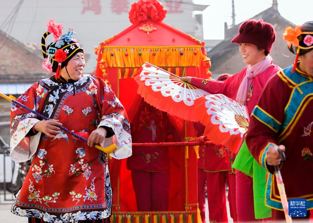 3月8日,在河南省焦作市博爱县柏山镇义沟村,村民表演节目。新华社发(程全 摄)