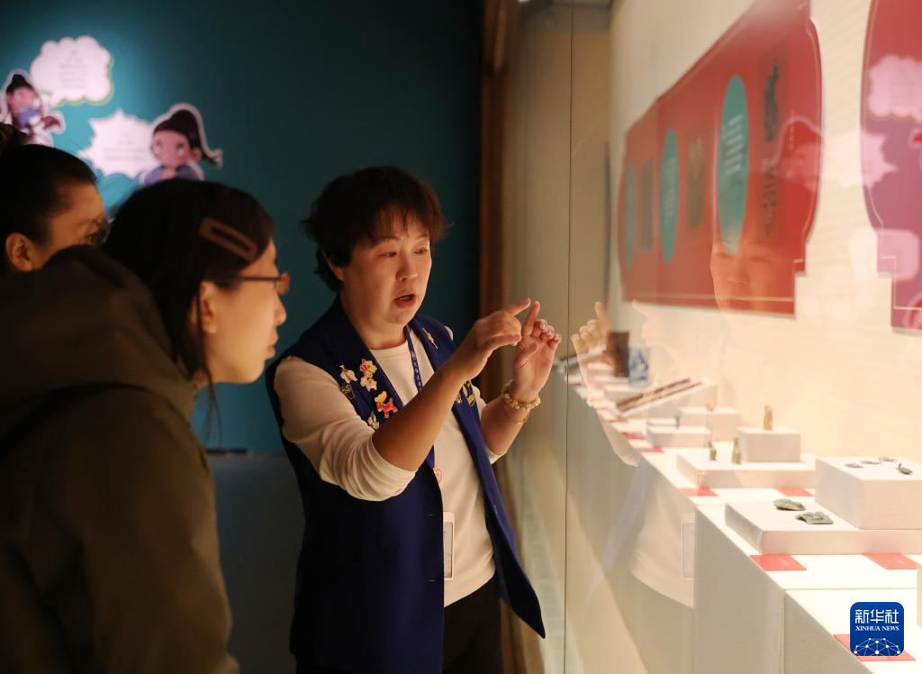 3月8日,辽宁省博物馆举行公益讲解、亲子互动、精品折扣活动。这是志愿者舒女士(右)为游客讲解“丙午马年生肖文物展”。新华社记者 李钢 摄