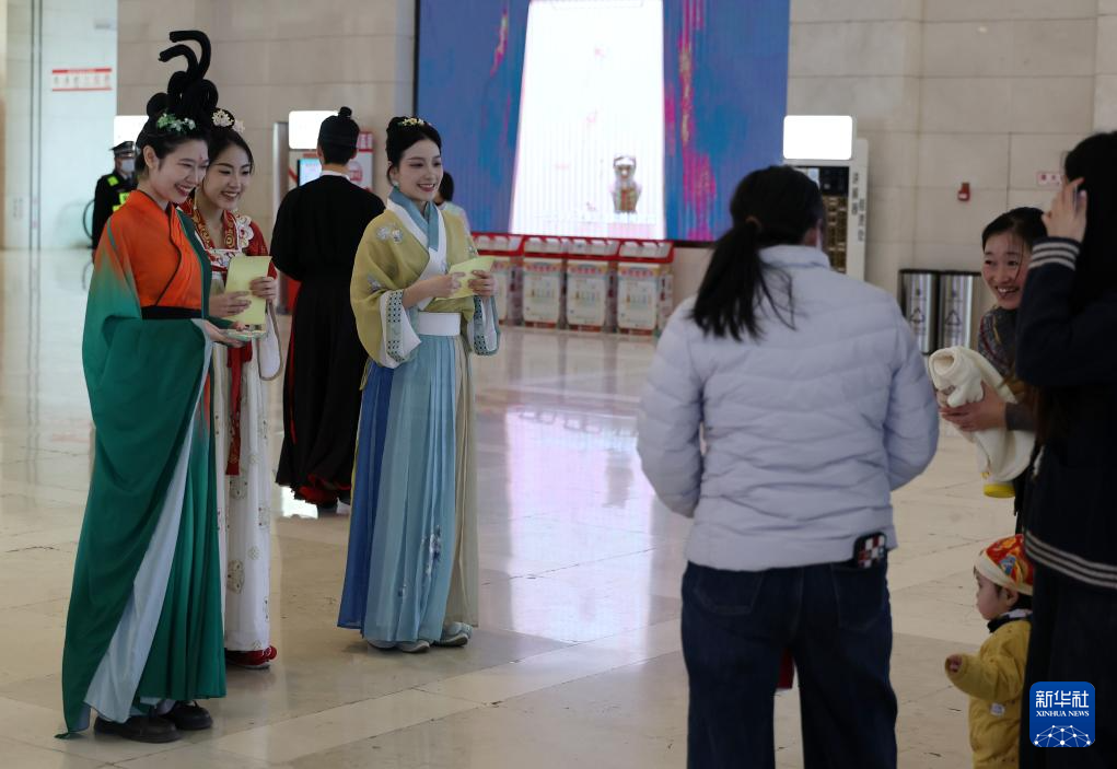 3月8日,辽宁省博物馆举行公益讲解、亲子互动、精品折扣活动。这是工作人员在入口处迎候游客。新华社记者 李钢 摄