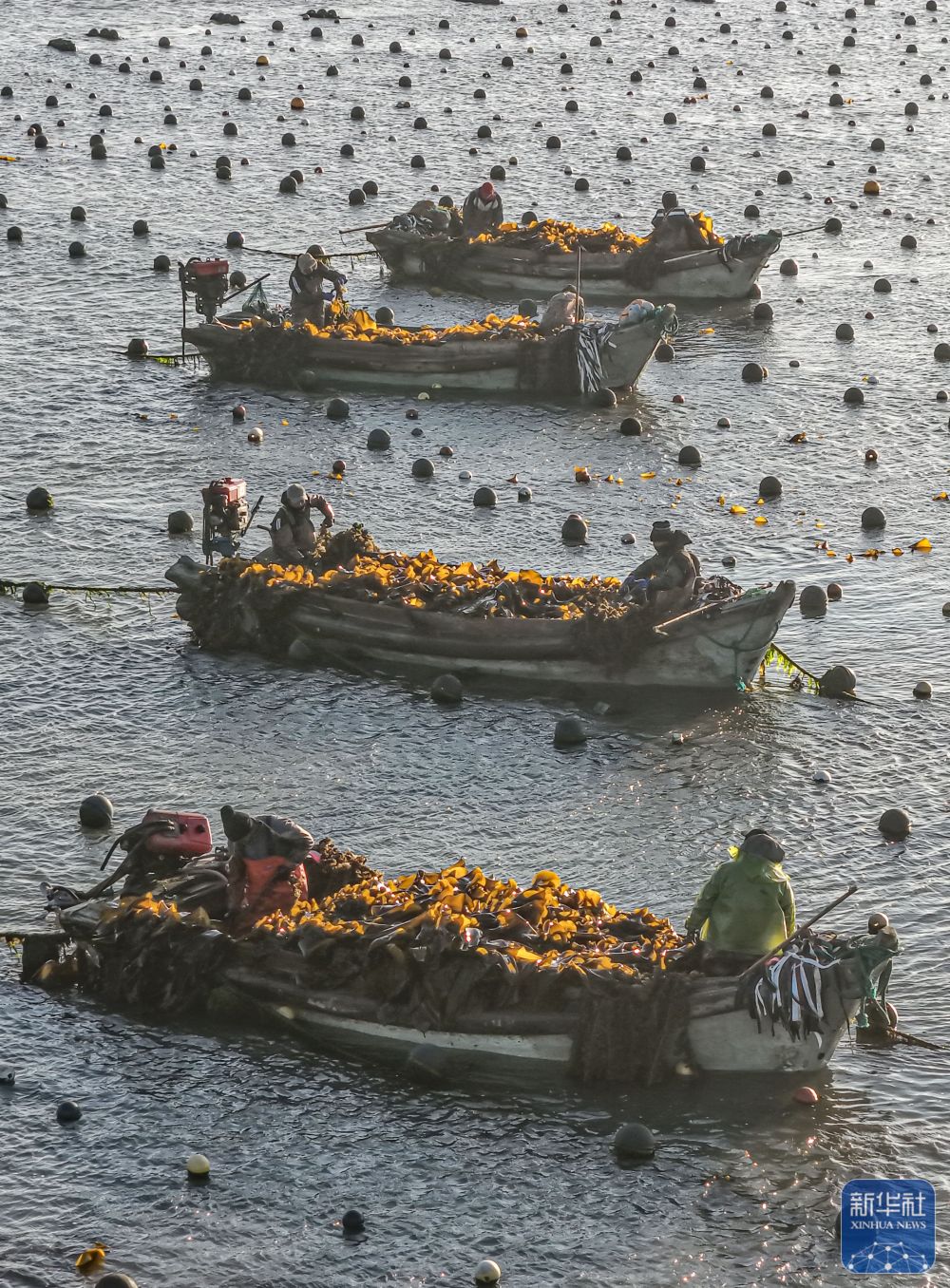 ↑ 3月9日,在山东省荣成市爱伦湾海洋牧场海带养殖区,养殖工人收获海带(无人机照片)。新华社发(王福东摄)