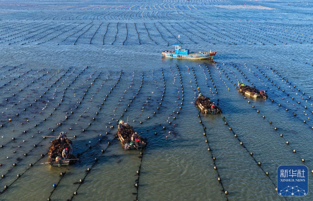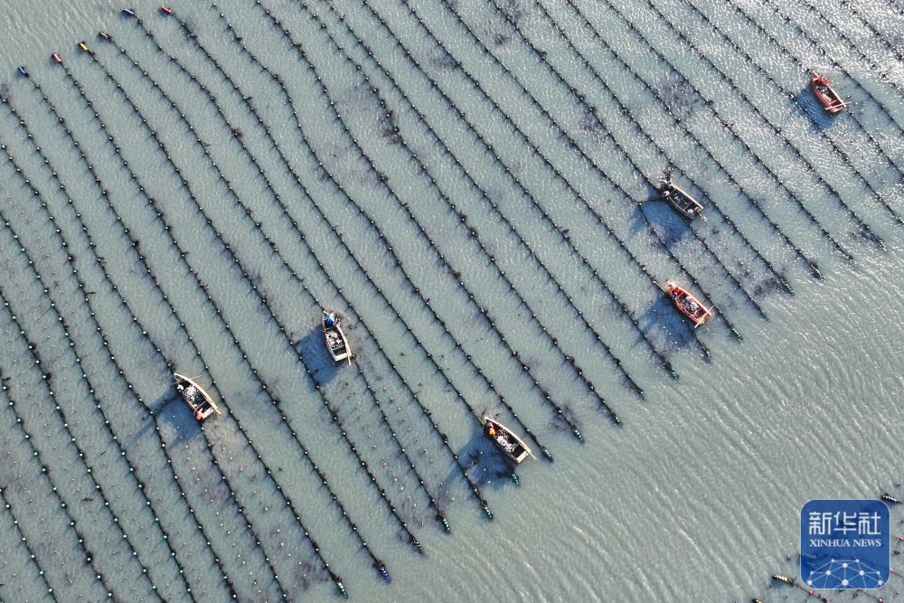 ↑ 3月9日,在山东省荣成市爱伦湾海洋牧场海带养殖区,养殖工人收获海带(无人机照片)。新华社发(李信君摄)