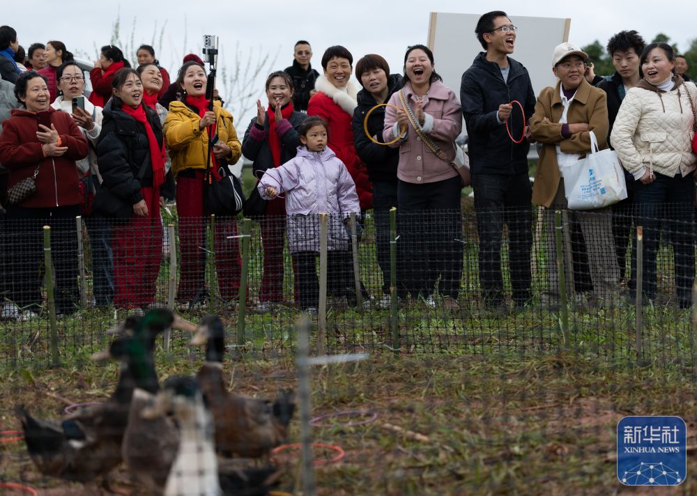3月14日,当地村民和游客参加套鸭体验活动。