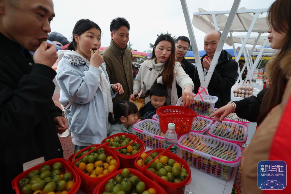 3月14日,游客在乡土集市上品尝小西红柿。