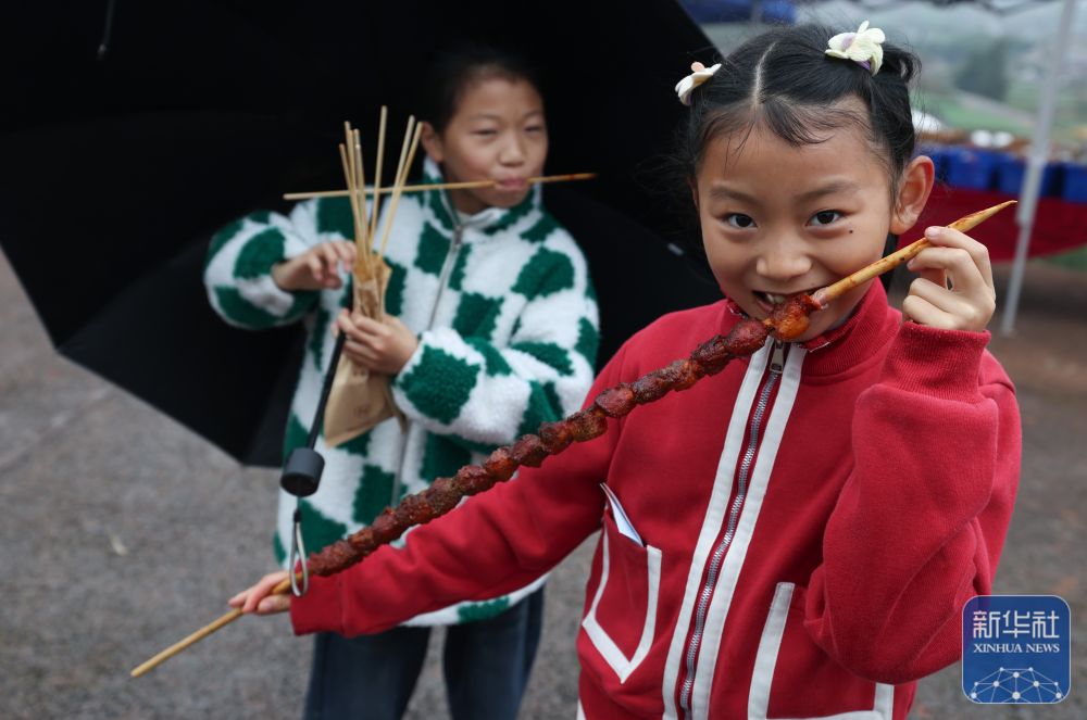 3月14日,两名小朋友在美食摊位品尝烤串。