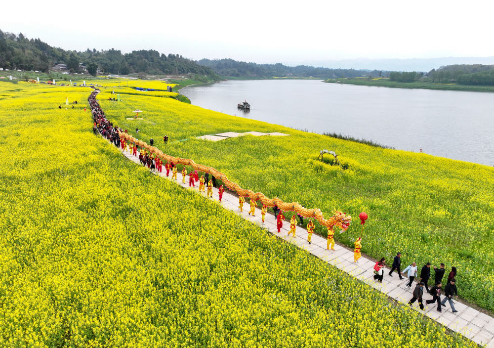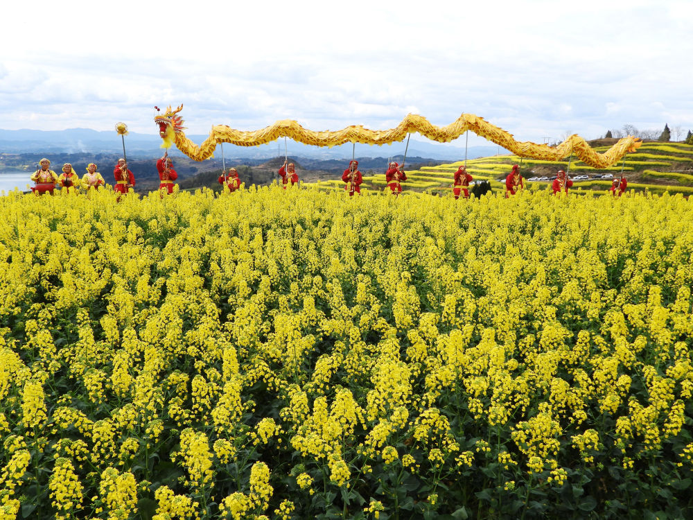 ↑四川省达州市达川区龙会乡张家山村在油菜花田间举办舞龙活动(3月2日摄)。新华社发(邓良奎摄)