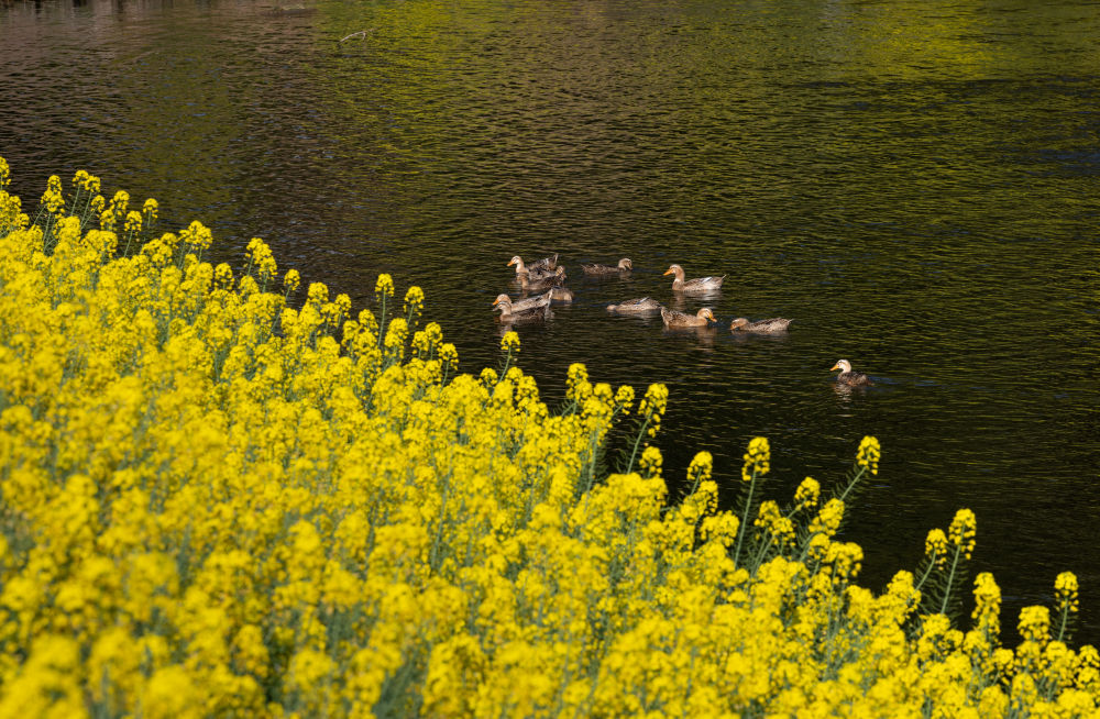 ↑在四川省峨眉山市符溪镇,一群鸭子在峨眉河中游动觅食,岸边是金黄的油菜花(3月4日摄)。新华社记者 江宏景 摄