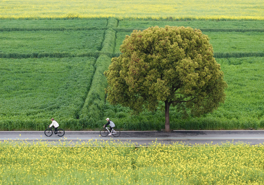 ↑两名游客骑行在四川省峨眉山市九里镇汪家村的油菜花田旁(3月6日摄,无人机照片)。新华社记者 江宏景 摄