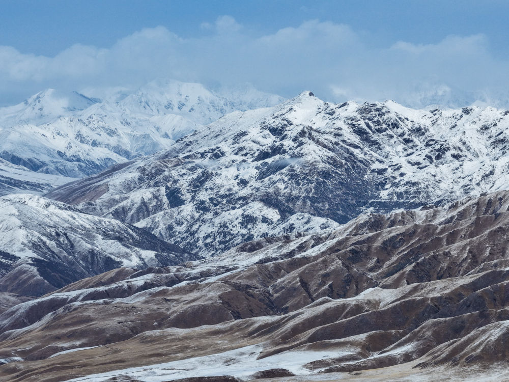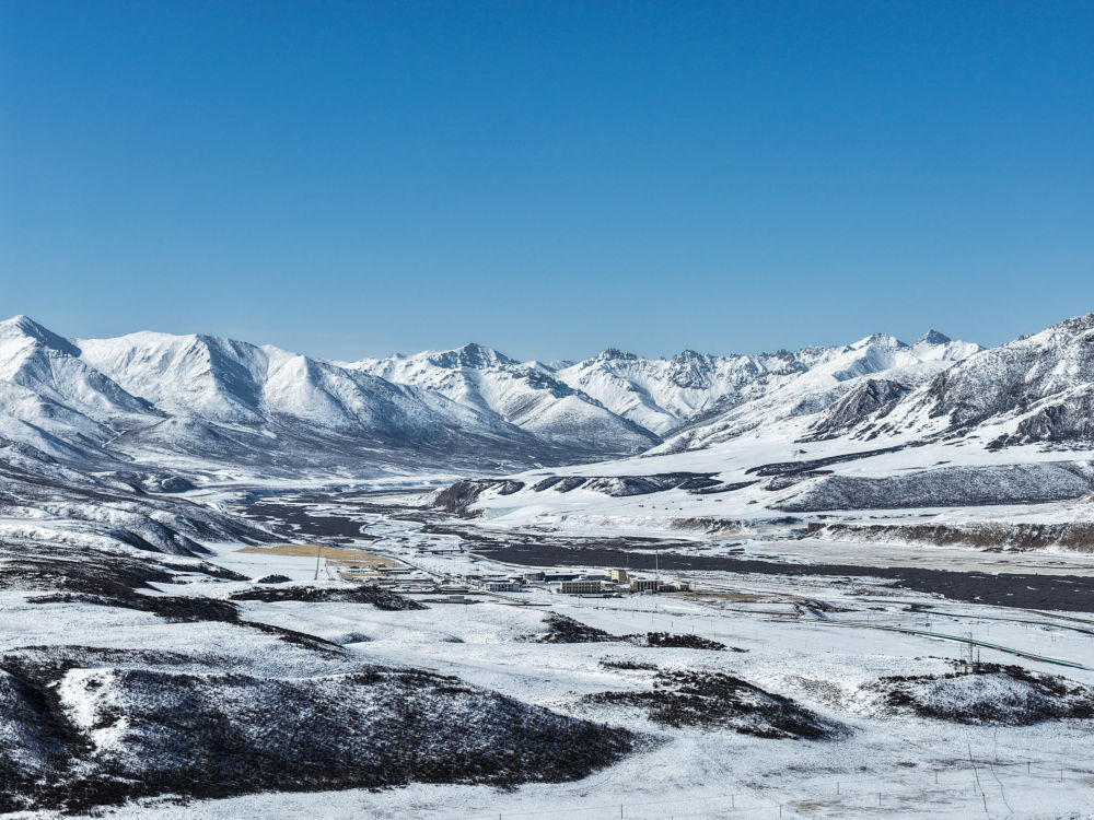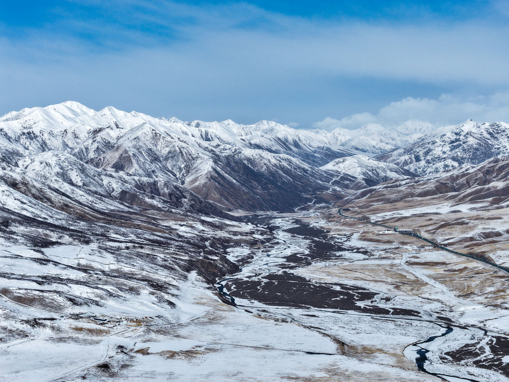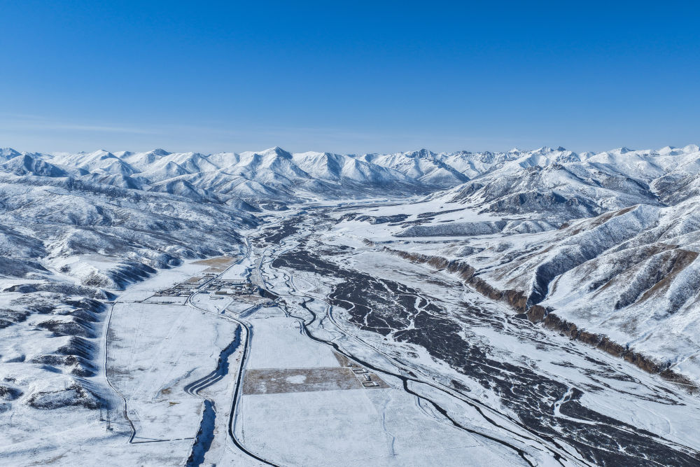 3月15日,青海省果洛藏族自治州玛沁县雪后迎来晴好天气,群山被白雪覆盖,与蓝天相映,构成一幅壮美的高原春日图景(无人机照片)。