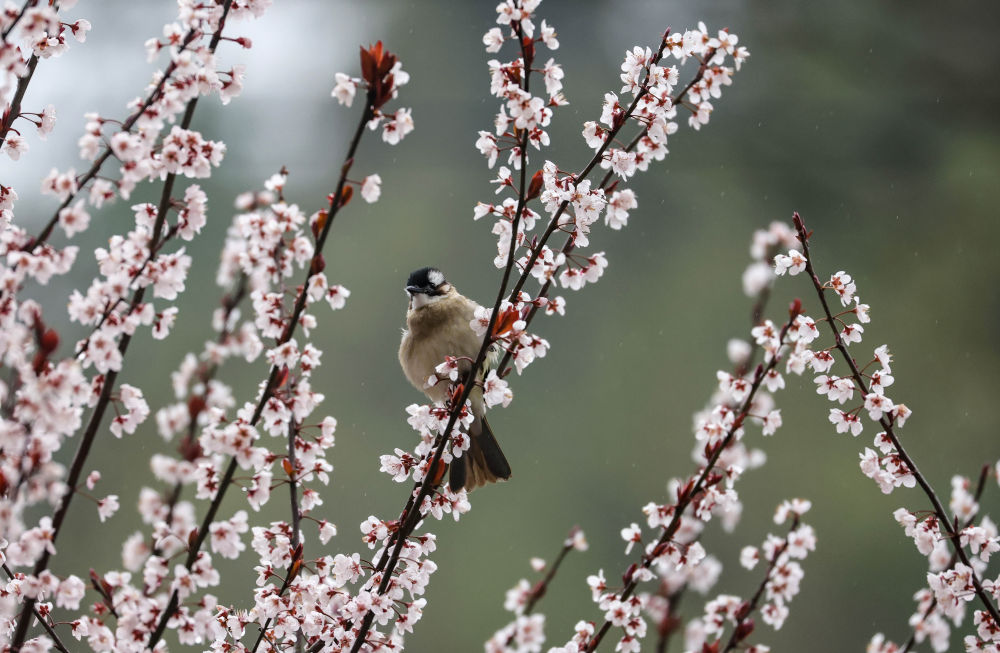 3月16日,小鸟在贵州省铜仁市玉屏侗族自治县皂角坪街道茅坪村的花间觅食。新华社发(胡攀学摄)