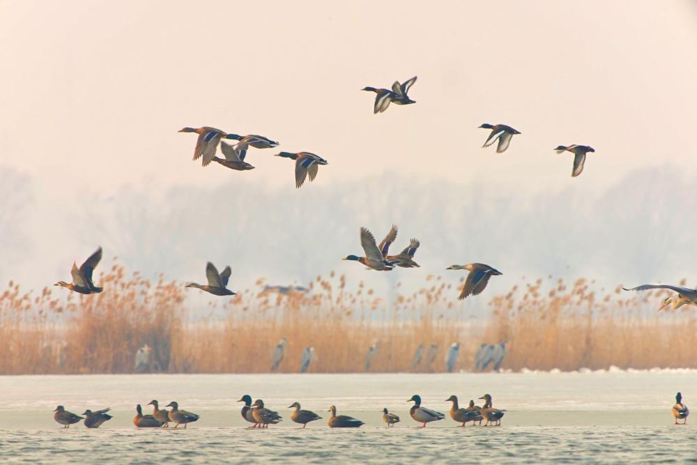 这是3月17日在黑龙江省齐齐哈尔市拍摄的野鸭群。新华社发(王勇刚摄)