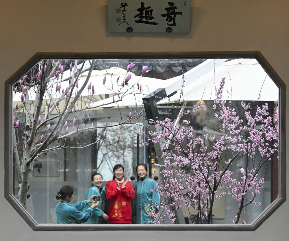 3月18日,游客在江苏省扬州市何园景区赏花拍照。新华社发(孟德龙摄)