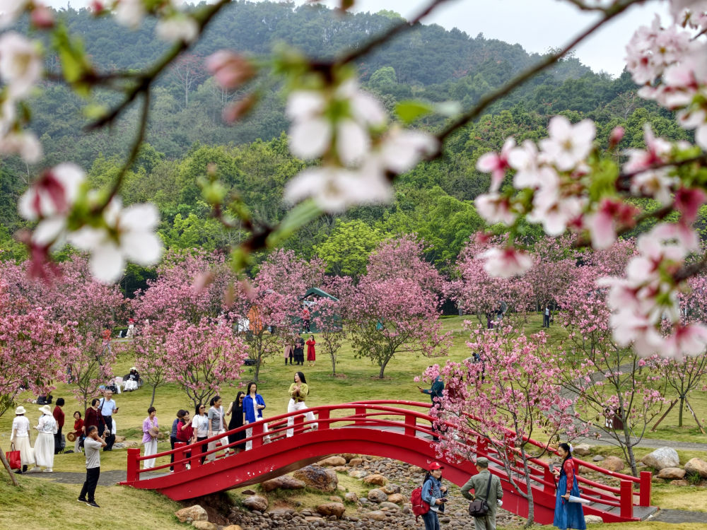 3月17日,游人在广西南宁市青秀山风景区樱花园赏花游玩。新华社发(喻湘泉摄)