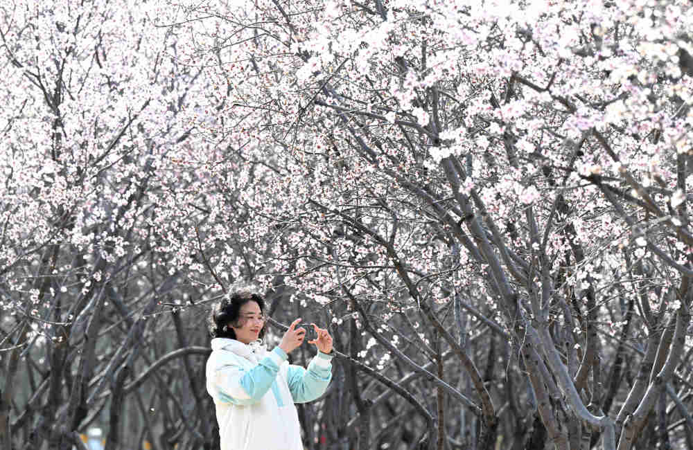 3月18日,游人在河北省石家庄市桥西区环城水系绿地拍摄山桃花。新华社发(陈其保摄)