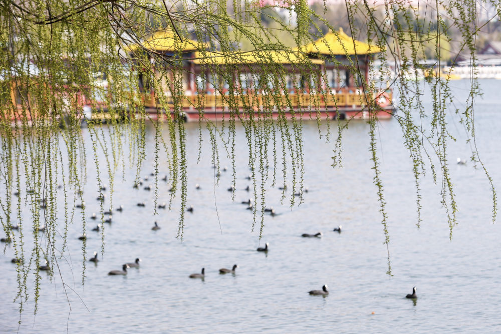 3月19日,在山东省济南市大明湖,杨柳依依,一群白骨顶鸡畅游湖水之中。新华社发(郝鑫城摄)