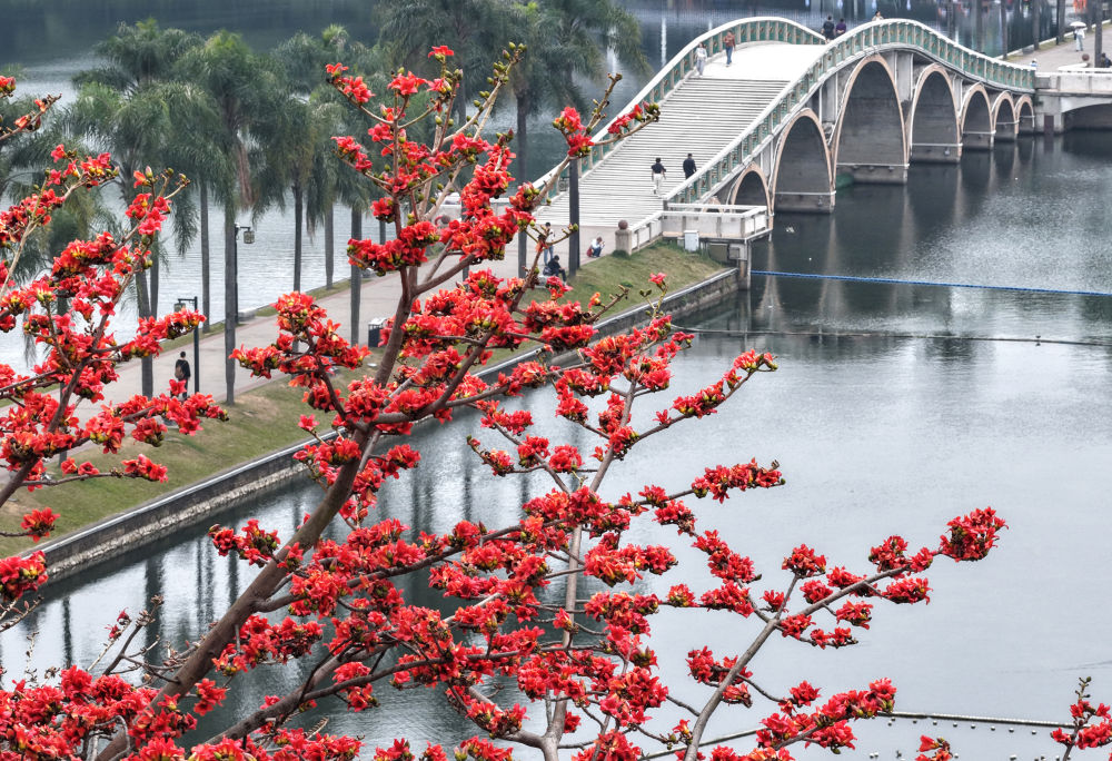 这是广西南宁市南湖岸边盛放的木棉花(3月19日摄,无人机照片)。新华社记者 周华 摄