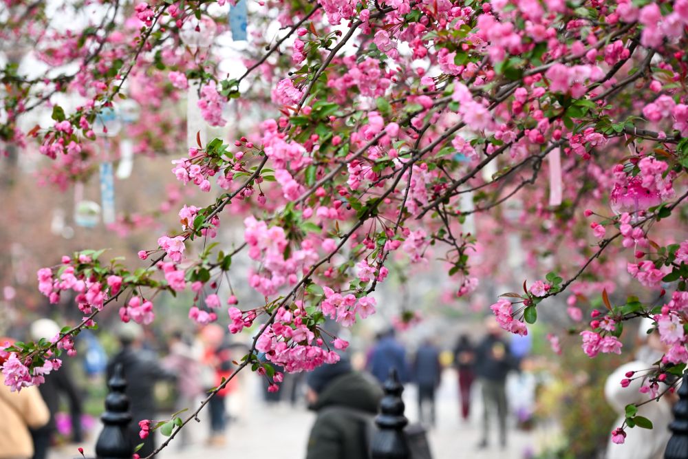 3月19日,游人在江苏南京莫愁湖公园赏花游玩。新华社发(杨素平 摄)