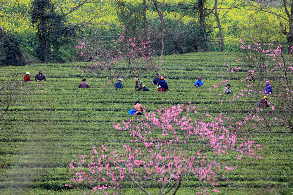 3月19日,在湖南省湘西土家族苗族自治州龙山县红岩溪镇肖家坪村,茶农在采摘春茶嫩芽。新华社发(曾祥辉 摄)