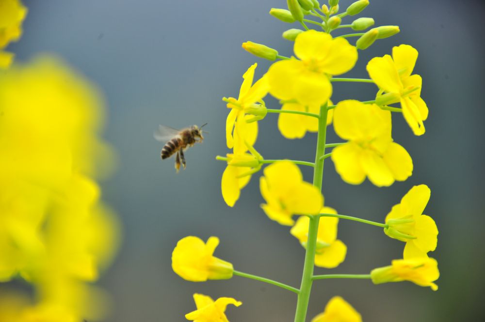 3月19日,蜜蜂在广西河池市罗城仫佬族自治县新印村油菜花间徘徊。新华社发(吴耀荣 摄)