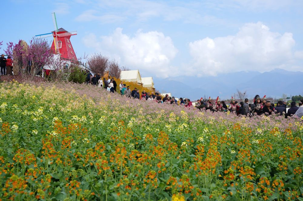 3月18日,游人在陕西省汉中市汉台区皇塘水乡景区彩色油菜花田赏花观景。新华社发(刘俊强摄)