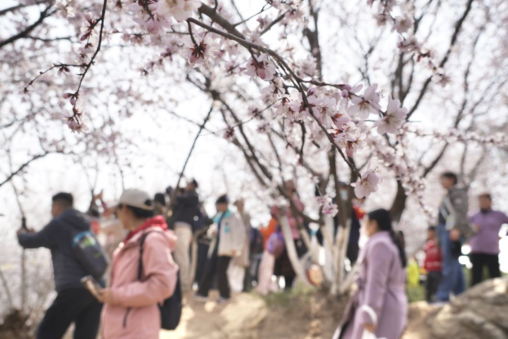 3月21日,游人在北京园博园赏花拍照。