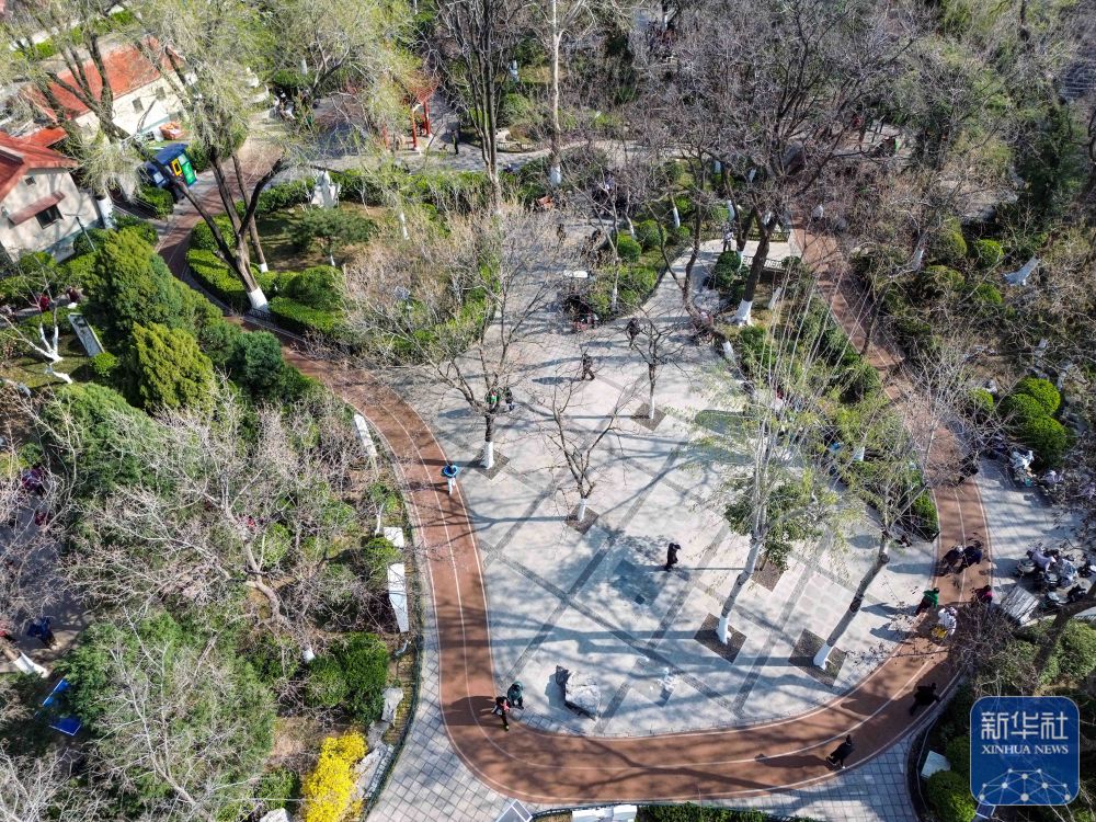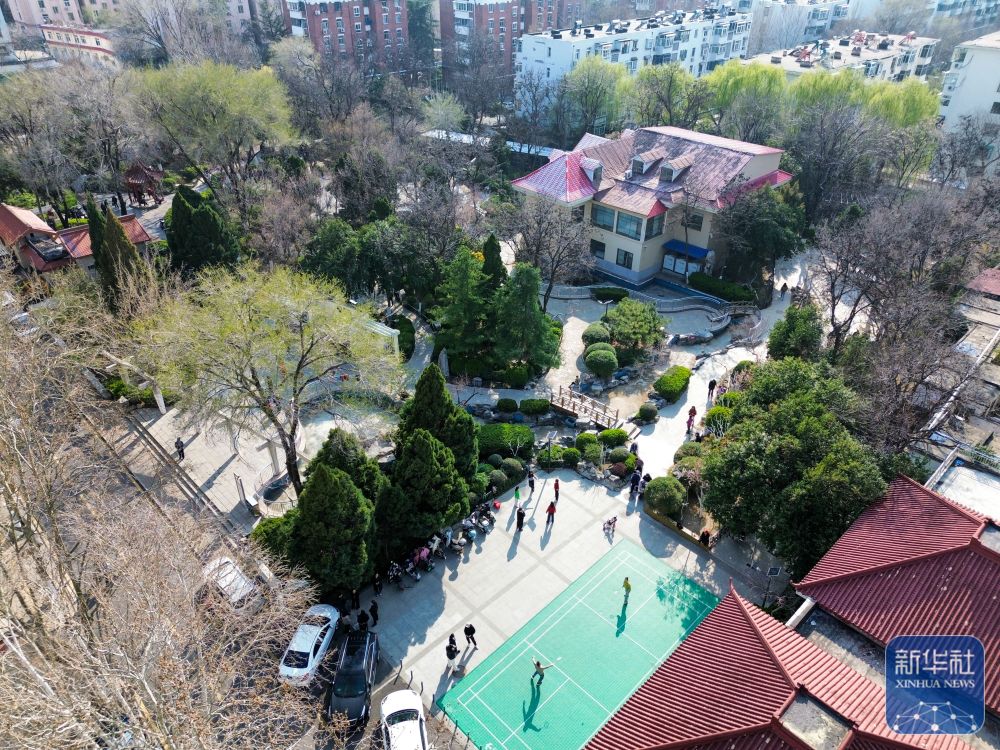 ↑ 济南市历下区燕子山中区社区内,居民在升级后的“口袋公园”内参加健身活动(3月19日摄,无人机照片)。